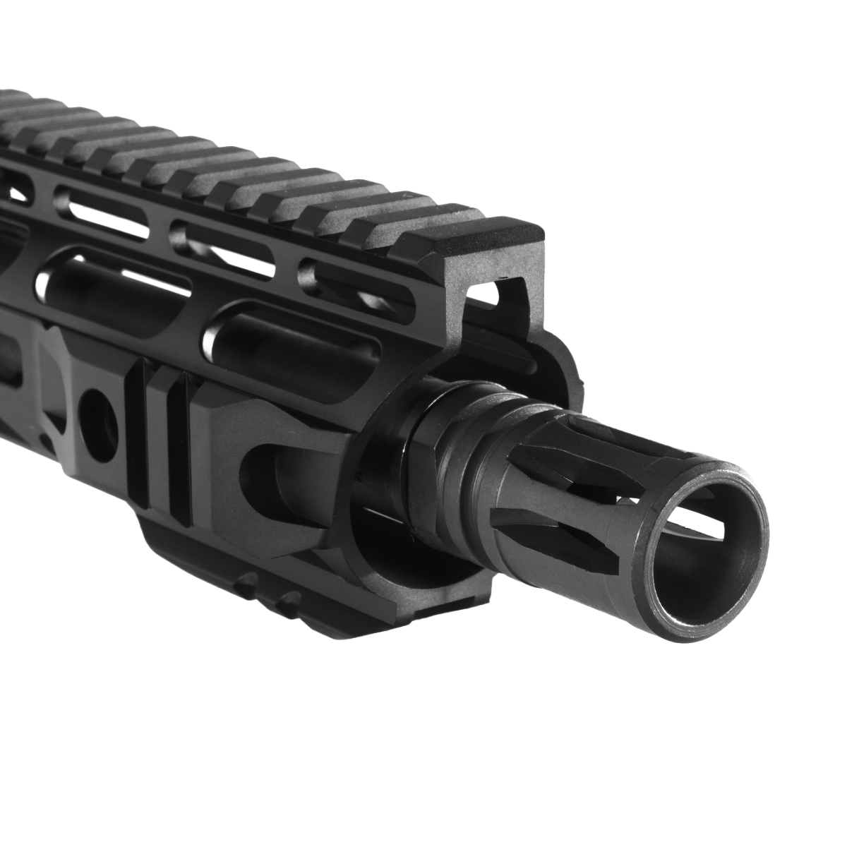 The 10-inch M-Lok freefloat handguard features 6061-T6 aluminum construction with M-Lok slots for modular accessory attachment. The freefloat design isolates the barrel from external pressure, supporting accuracy in compact upper configurations.