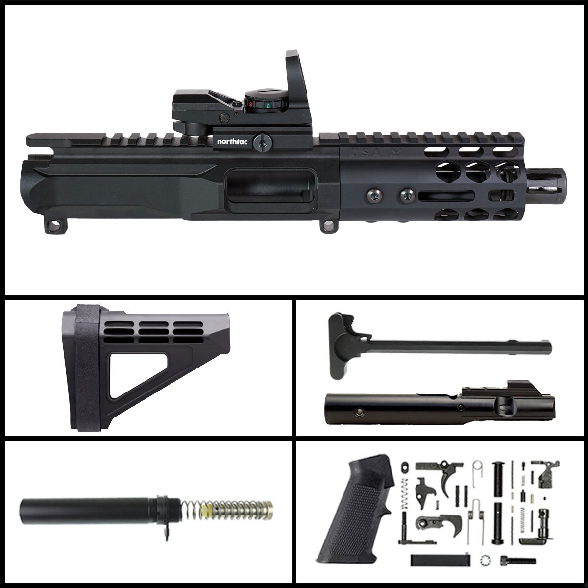 This Build Features The "Vertex" Pistol AR-15 Caliber Billet Upper Receiver. The Vertex Upper Is Machined Out Of A Single Block Of 7075 T6 Billet Aluminum To Create Its Intricate Lines And Angles And Finished With A Hard Coat of Black Anodization. The Vertex Upper Was Designed To Be Used With Pistol Calibers Specifically And As A Result Doesn't Have A Dust Door Or Forward Assist. This Was Done To Save Weight As Well as Improve Functionality And Reliability By Focusing On A Simple Design That Has Fewer Moving Parts And Therefore Fewer Parts That Can Break, All The While Not Compromising On Strength And Durability. This Upper Will Fit On A Traditional Mil-spec Lower Receiver Or A Pistol Caliber Specific Lower Receiver.