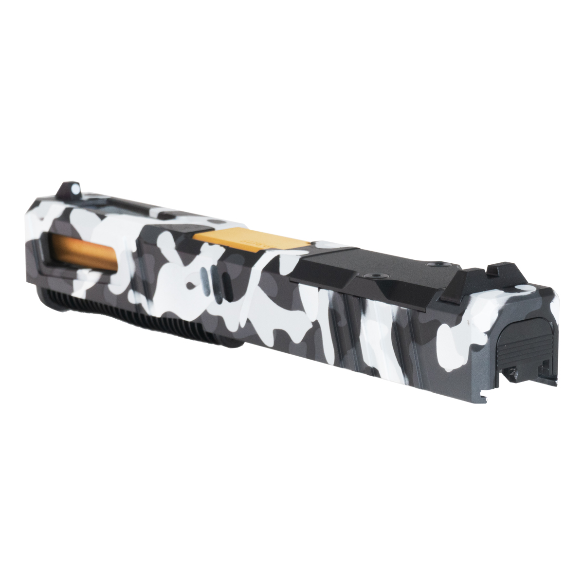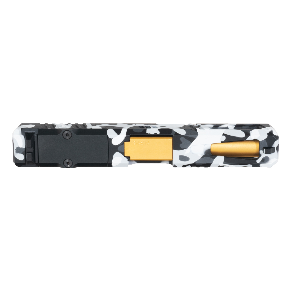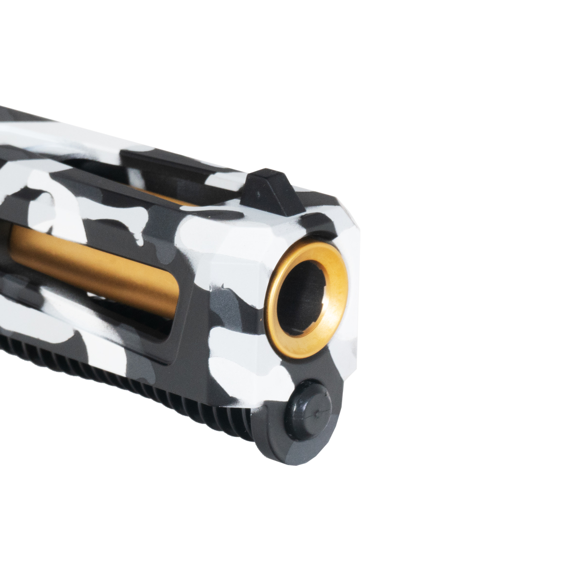 The DTT Stiffler MFG Lionheart Crowned Gold TiN Barrel G19 Gen 1-3 Compatible 9MM Winter Camo RMR Complete Slide Kit is engineered for Glock enthusiasts seeking reliable performance and distinctive aesthetics. This complete slide assembly features a Winter Camo Cerakote finish, making it both visually appealing and resistant to wear. The kit includes a G19 Gen 3 compatible barrel made from 416R stainless steel, finished with a Gold TiN coating, and a 1:10 twist for optimal ballistic performance.