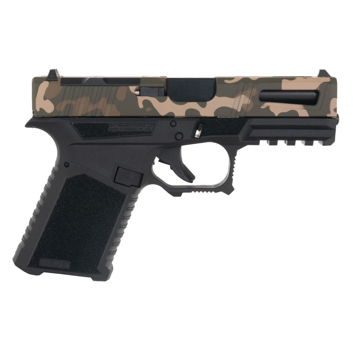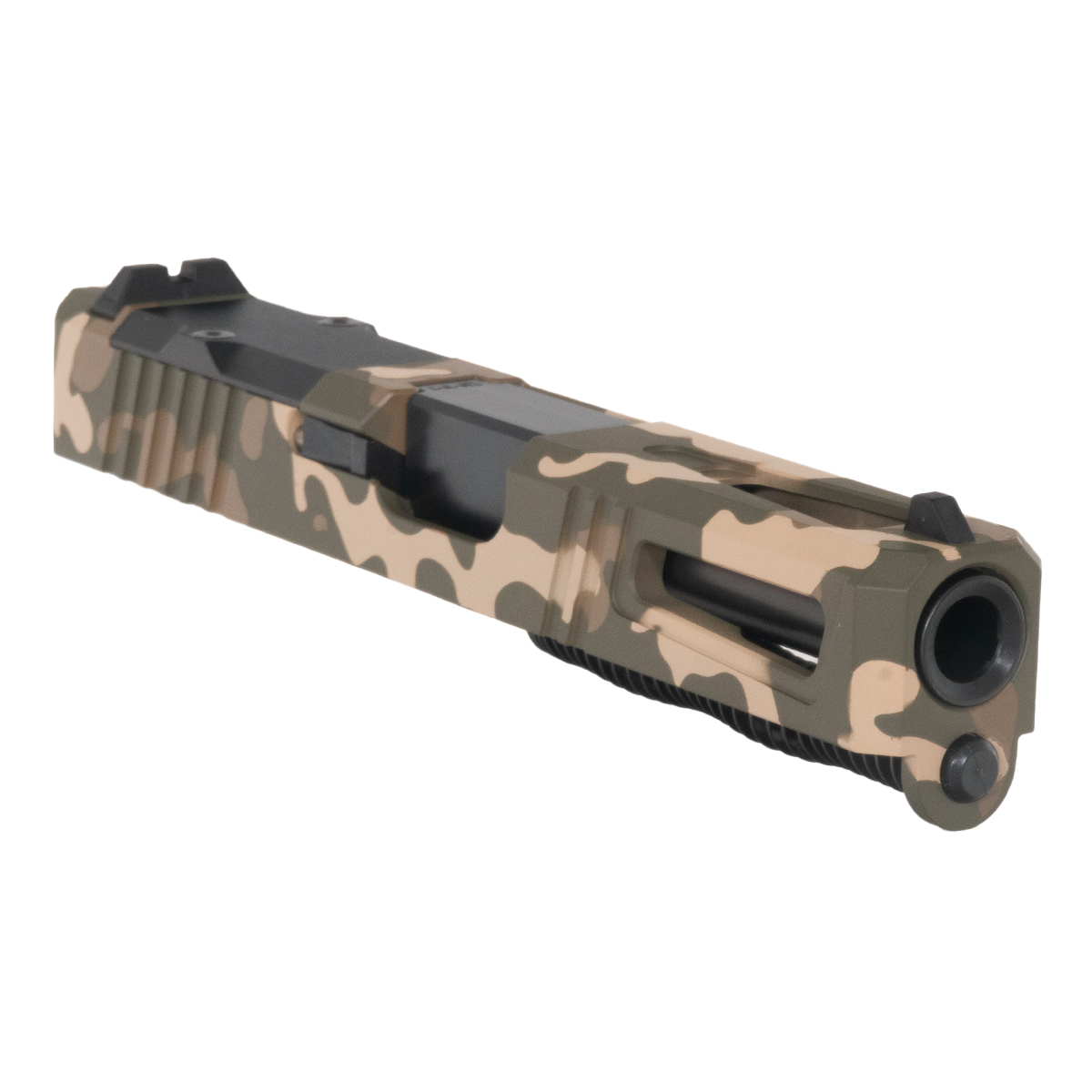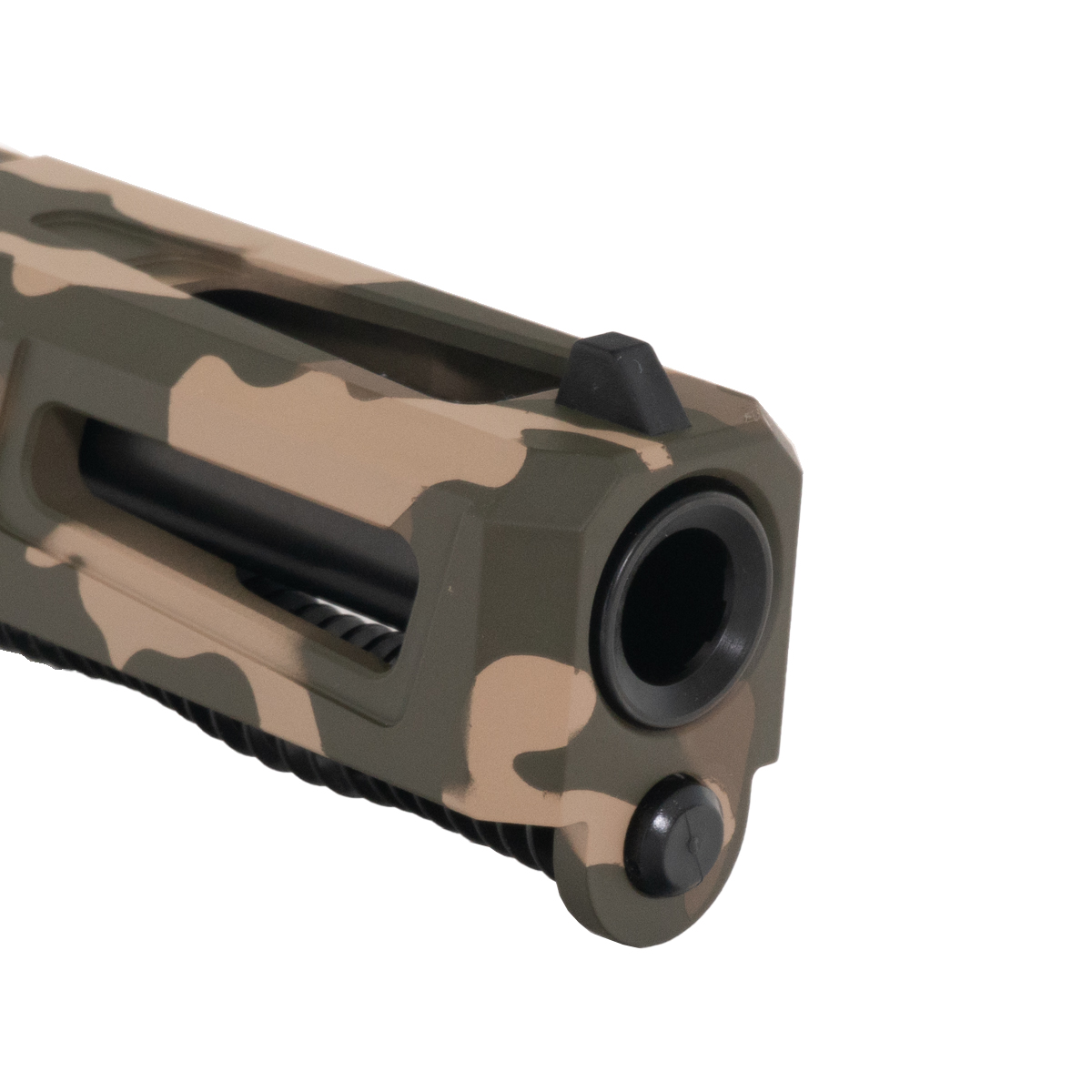 The DTT Stiffler MFG Lionheart Crowned Nitride Barrel OD Camo RMR Complete Slide Kit is engineered for G19 Gen 1-3 compatibility, delivering a robust 9MM option for firearms enthusiasts. The kit features a precision-crafted 416R Stainless Steel barrel finished with a Crowned Nitride coating, offering improved performance and corrosion resistance. The complete slide showcases an OD Camo Cerakote finish, ensuring durability while providing a distinctive camouflage aesthetic.
