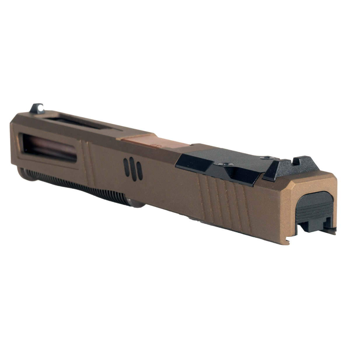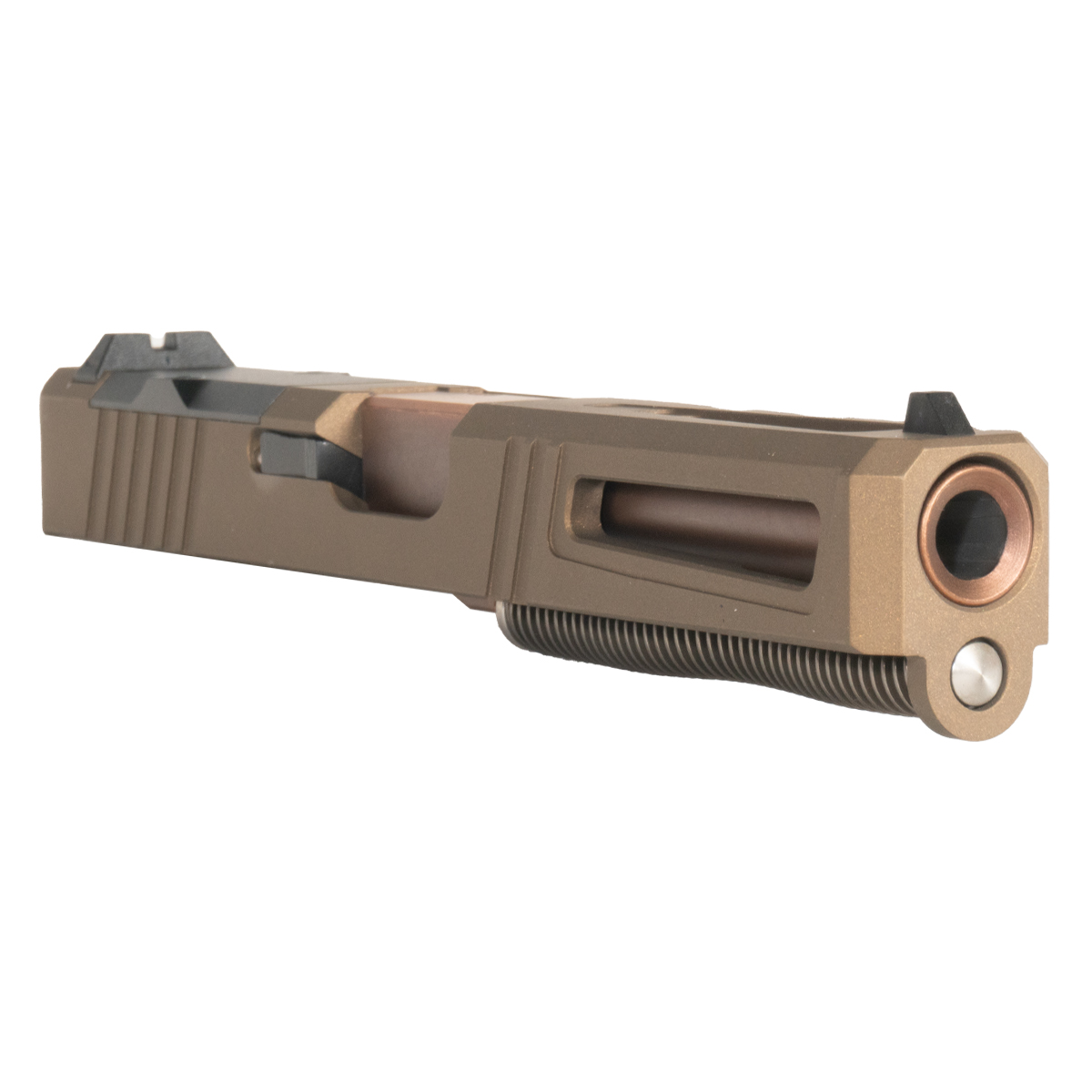 The Lionheart Ported Copper PVD Barrel G17 Gen 1-3 Compatible 9MM Burnt Bronze RMR Complete Slide Kit from DTT Stiffler MFG is engineered for Glock 17 platforms, specifically compatible with Gen 1-3 models. This complete slide kit features a robust slide made from 17-4 stainless steel, finished in a durable burnt bronze Cerakote for enhanced corrosion resistance. The slide is designed to accommodate RMR optics, ensuring reliable performance for precision shooting.