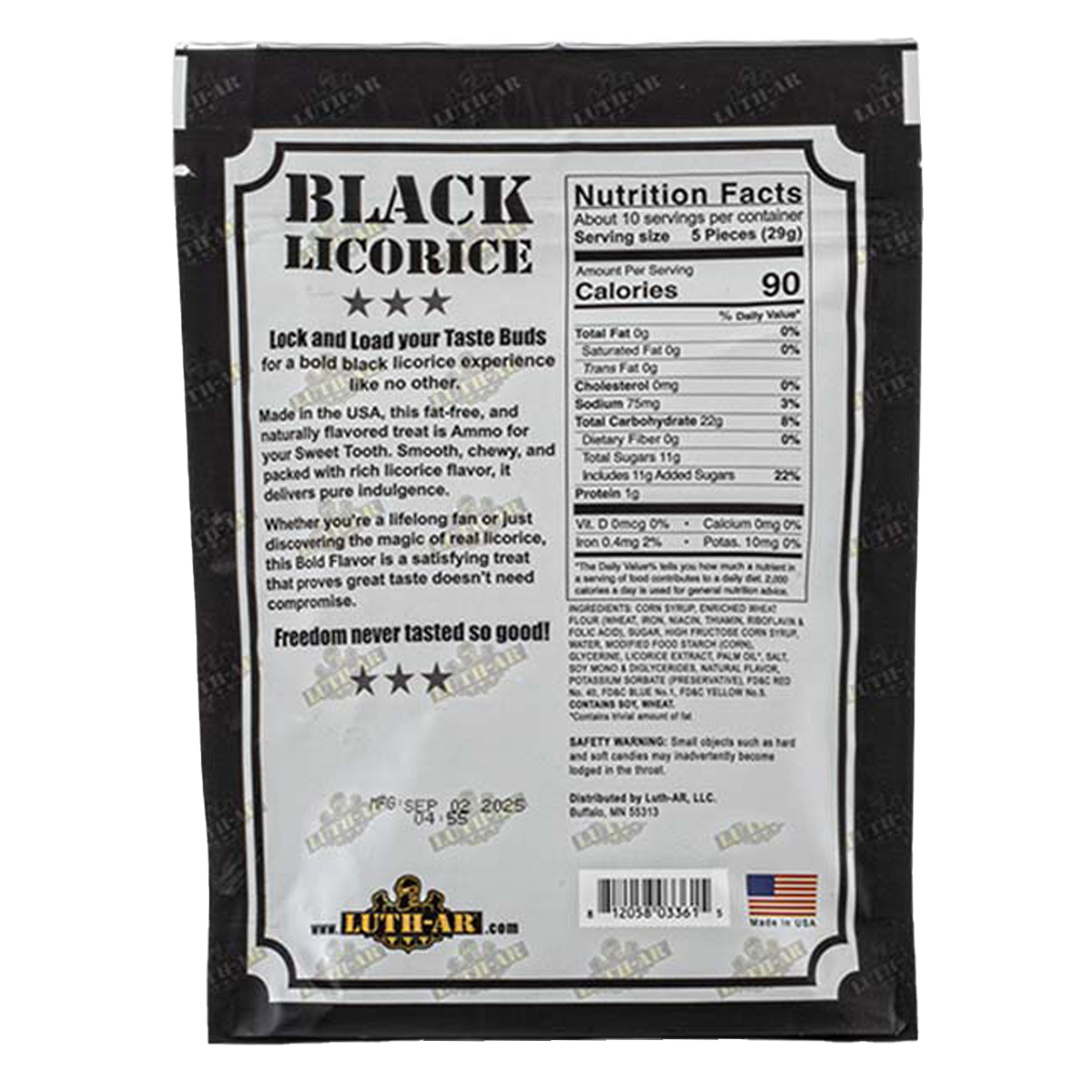 Lock and load your tastebuds with Luth-AR Black Licorice, a bold black licorice experience like no other. Made in the USA, this fat-free, naturally flavored treat is the ultimate “ammo” for your sweet tooth. Smooth, chewy, and packed with rich licorice flavor, Black Licorice by Luth-AR delivers pure indulgence whether you enjoy it in the gunroom or at the range.