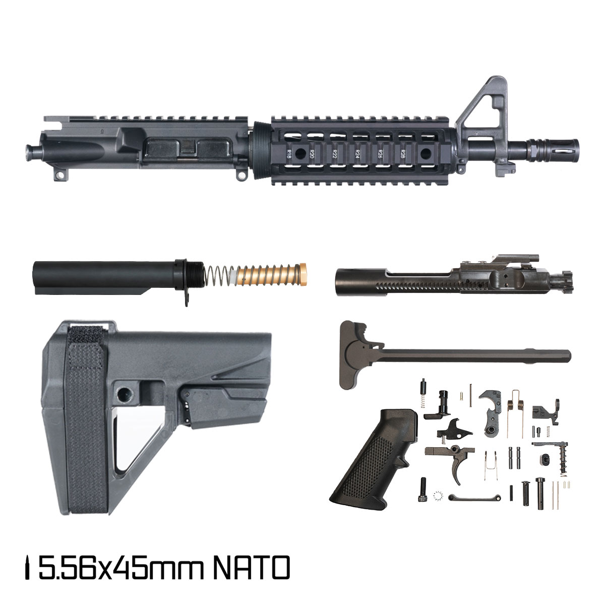 Follow safe handling practices and manufacturer instructions for assembly and use. Ensure compliance with all applicable federal, state, and local laws regarding pistol configurations and stabilizing braces. This kit is chambered in 5.56 NATO. This kit includes all necessary components to complete the build—lower receiver sold separately.