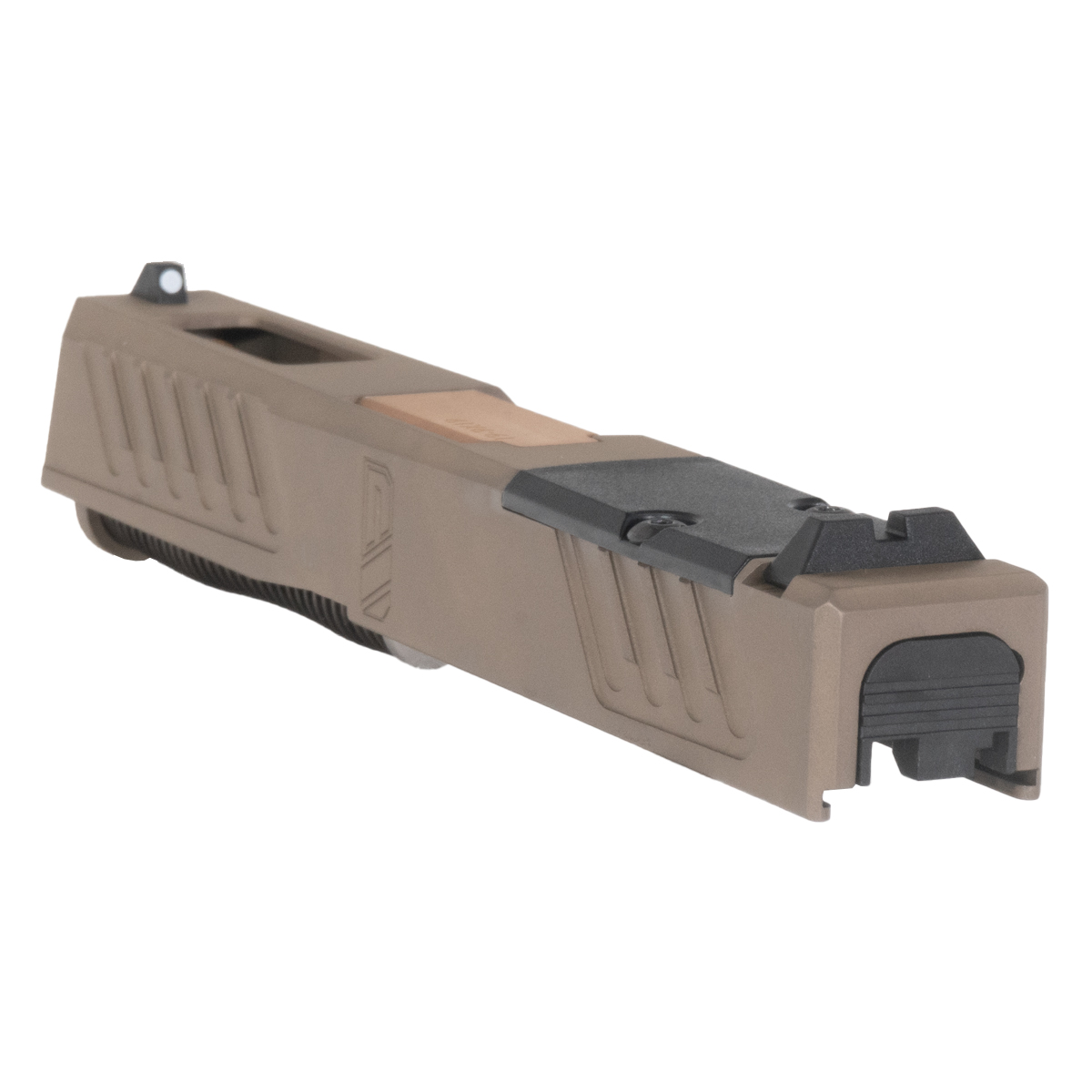The slide, designed for compatibility with RMR optics, showcases a Stiletto slide type finished in a Flat Dark Earth (FDE) PVD coating. The complete assembly also includes a short sight assembly in black for optimal targeting. With its precision machining and robust materials, this slide kit serves as an excellent choice for gunsmiths looking to customize and enhance their Glock 19 9mm platform, all while embracing quality and functionality.