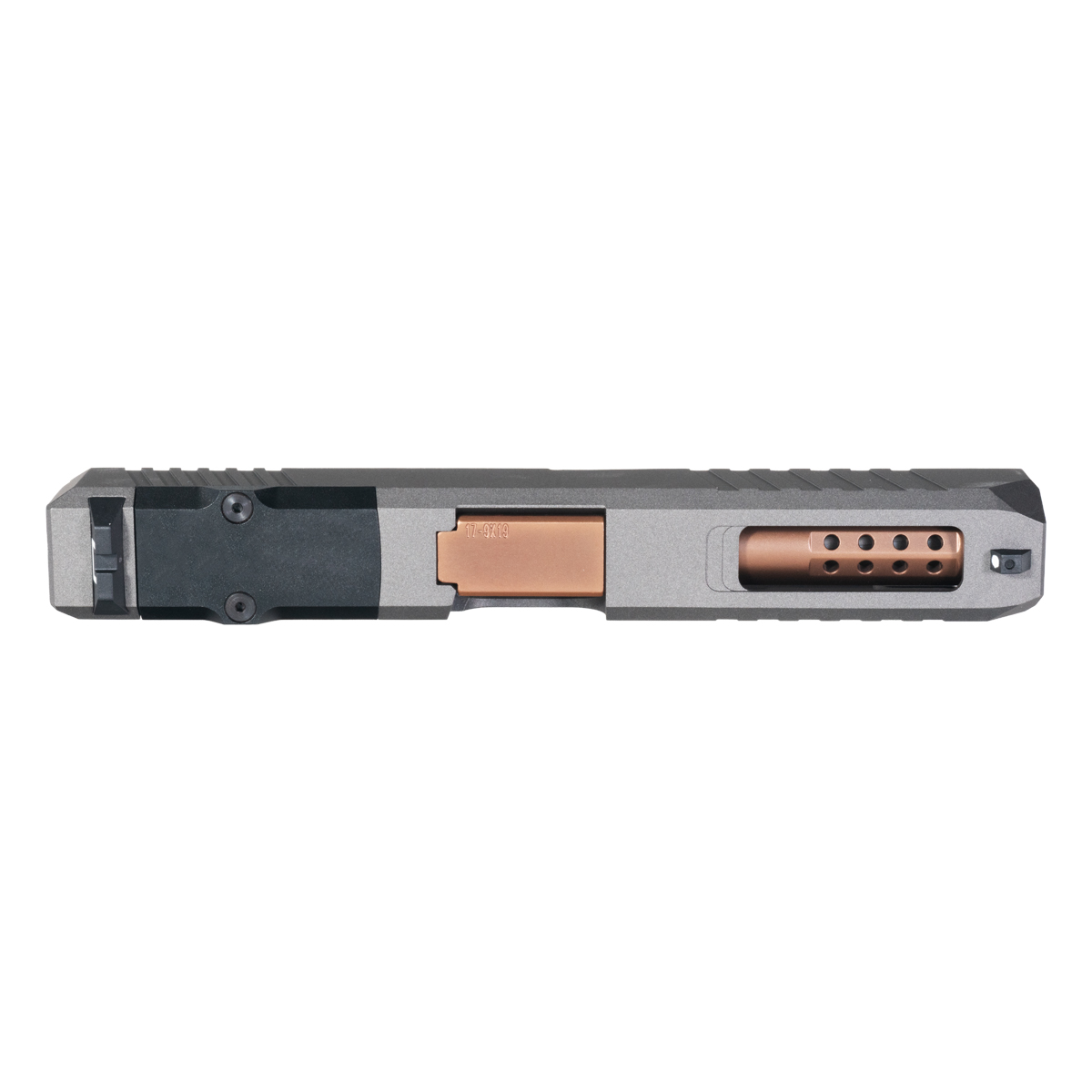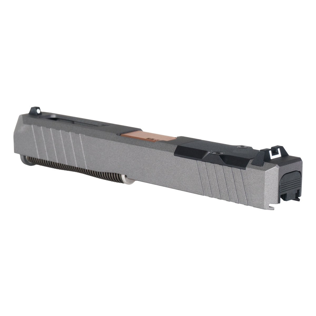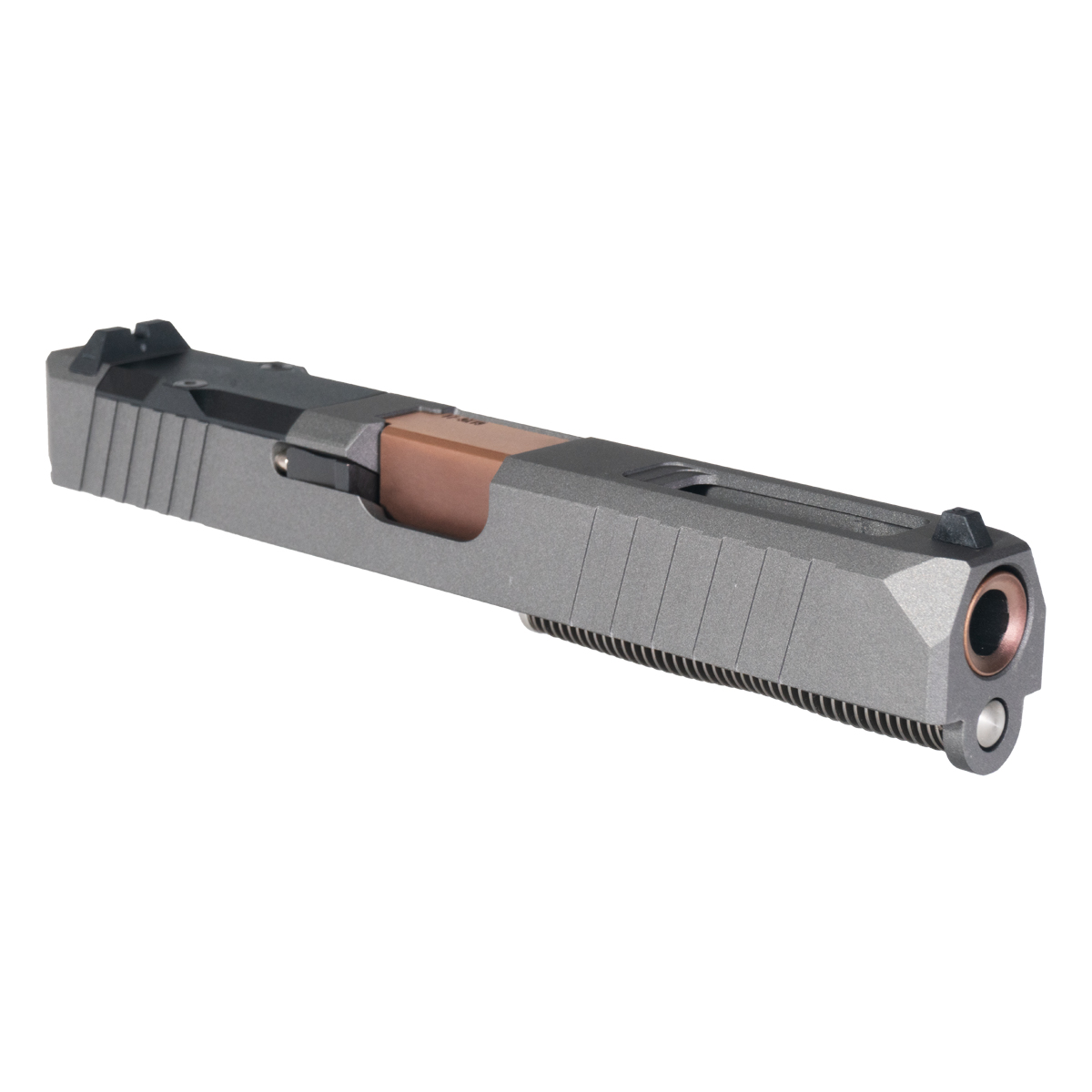 17-4 Stainless Steel Turbo Slide with Tungsten Cerakote: The Turbo Slide is made from durable 17-4 stainless steel, providing superior strength and structural integrity for high-round-count competition and tactical applications. The 17-4 material offers excellent corrosion resistance and wear characteristics while maintaining dimensional stability through demanding use. The striking tungsten Cerakote finish provides both protection and aesthetic appeal, creating distinctive grey tone that contrasts beautifully with the copper barrel for unique visual impact. This finish protects the slide from environmental exposure, holster wear, and rough handling while maintaining professional appearance essential for competition and custom builds.