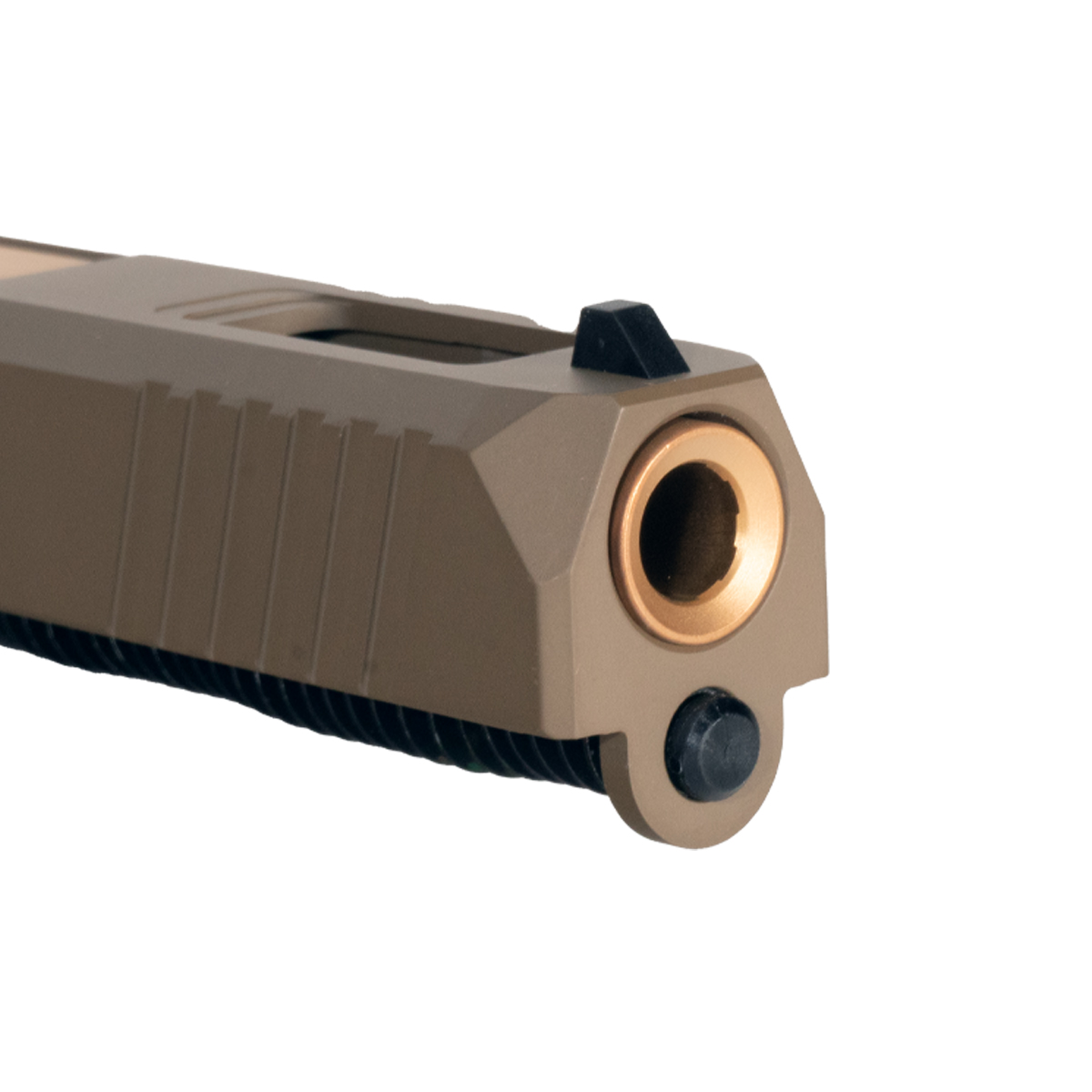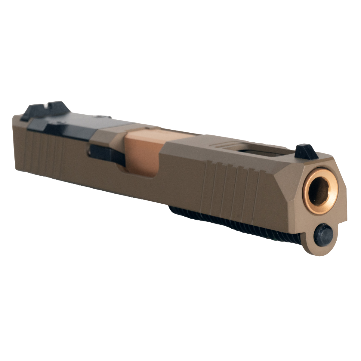 The Wayfinder Ported Copper PVD Barrel G19 Gen 1-3 Compatible 9MM FDE RMR Complete Slide Kit from DTT Stiffler MFG delivers precision and performance for Glock enthusiasts. This kit includes a G19-compatible barrel made from steel, featuring a crown-cut design and a twist rate of 1:10. The copper PVD finish provides both aesthetic appeal and durability. The complete slide, constructed from 17-4 stainless steel, comes in Flat Dark Earth with a Graphite FDE Cerakote finish.
